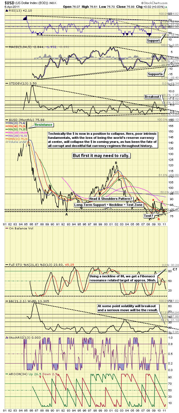 Moving onto the charts now, and as alluded to above, technicals associated with the $ have now caught up to the fundamentals in this most auspicious year, where as annotations below point out, it’s now in a position to collapse. This first chart gives us a shorter duration snapshot of the $ that shows the lower degree count, expected price path (down to 74 and then up to 81), and gold / SPX pricing, which is of course the mirror on the wall as the currency devaluation continues / accelerates. Also, it should be noted the corrective zigzag (denoted in red) that started in early 2009 is completed, making way for the $ to continue down to a more profound level. (See Figure 1)