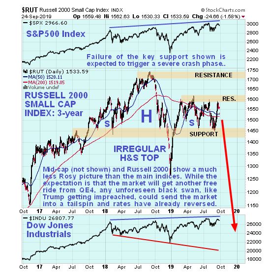 The markets don’t like uncertainty, but with this movement to impeach Trump possibly about to gain traction, that looks like what they may be about to get, in spades. If so, then the markets could quickly go into crash mode. So, with the main indices still relatively close to their recent highs, this may be a good time to consider short positions and Puts etc. Crash mode would be expected to be triggered by failure of the key support shown on the Russell 2000 chart. If this support is breached it may be best to step aside even from the PM sector or hedge as a mass liquidation event will leave very little unscathed.