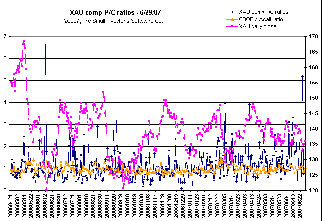 Jordan Roy-Byrne Jul 2, 2007 Gold's divergence since April was and still is troubling. Despite that divergence, multiple different indicators are now signaling that the precious metal sector could be at or approaching a major bottom. Though gold did break its uptrend from October 2006, it has failed to breakdown in a manner that would deem significant its recent underperformance. Another term for a breakdown that doesn't follow through is "shakeout." The converse is when a breakout occurs but isn't sustained. Let's start with sentiment. Weeks ago I posted a chart showing the total assets in the Rydex Gold fund and the price of the fund. We could see that the assets at that time, was considerably low given the price of the fund. Coincidentally, that level of assets usually marked a key bottom for the fund's price. Here is another measurement of sentiment: