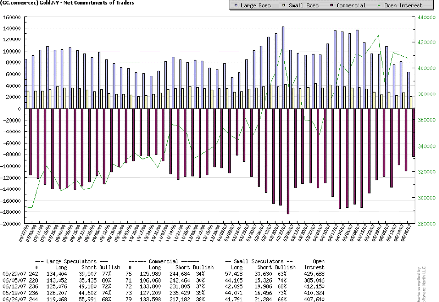 Source: The Small Investor's Software Co.The chart specifically highlights the put/call ratio for the options in the XAU index. If a trader is bullish he'll buy calls. If he's bearish he will buy puts. Thus, a high put/call ratio is evidence of bearish sentiment and serves as a great contrary indicator. As you can see, the last time the put/call ratio was in this territory, it was prior to the June 2006 bottom that produced a very strong rebound over the next few weeks and months. The current put/call ratio bodes well for a significant bottom to be in place. Next, here is the current Commitment of Traders (COT) Report: