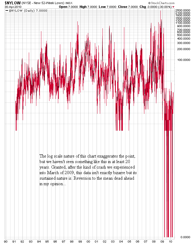 And to add to the technical data I posted when I asked if there were any stock market bears left the other day, the number of new 52 week lows in the New York Stock Exchange ($NYLOW) is showing a pattern unseen over the past 19 years (the data I have access to only goes back to 1991). I have heard many people speak about the number of new highs confirming the strength of this rally in general stocks. I would like to present the other side of the argument. To do so, I would like to show you the $NYLOW data using a 15 day moving average of this data over the past 19 years to smooth out the data using a linear scale chart. After that is a chart of the actual daily raw data on a log scale chart, which despite the noise gives a perspective on what we've been experiencing lately: