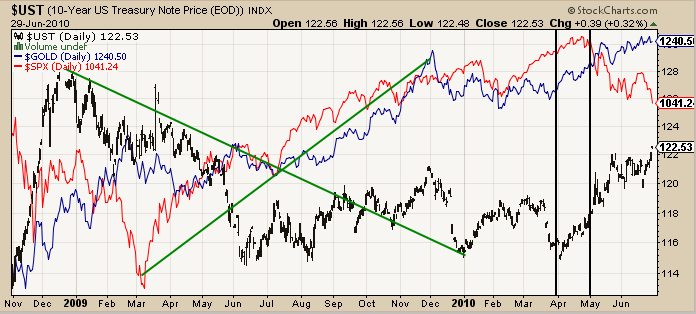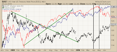 In the past couple of months, gold and bonds have risen with the dollar while stocks have rolled over. The shift of relationships, reflected by the rise of bonds with the market in April, was a warning of things to come. It was a sign that fear had covertly entered the system. Gold was no longer an anti-dollar trade; it was a "flight to safety" trade.