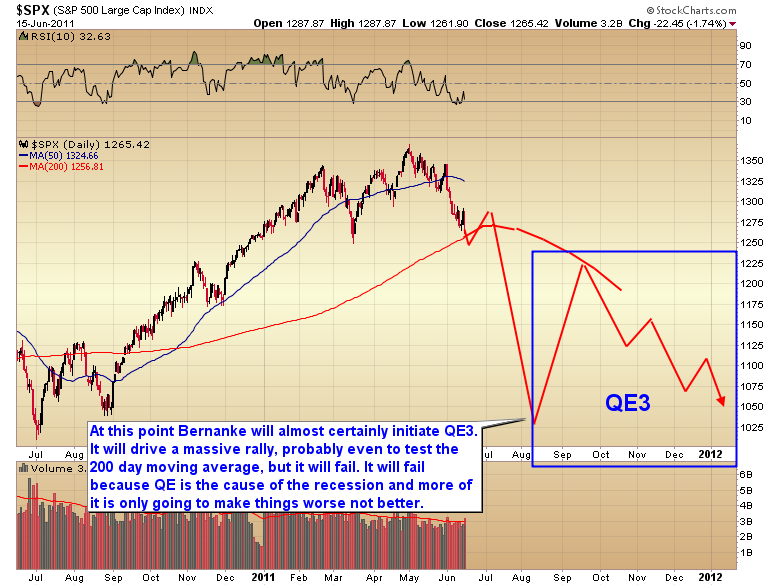 However this too will only be a counter trend affair. QE is the cause of our problems and more of it isn't going to make things better, it will only make them worse as it will start to spike commodity prices again into a rapidly weakening economy. Remember spiking commodity inflation is what caused this in the first place. Doing it again as the economy rolls over into recession is only going to guarantee that this turns into a depression instead of just a severe recession.
