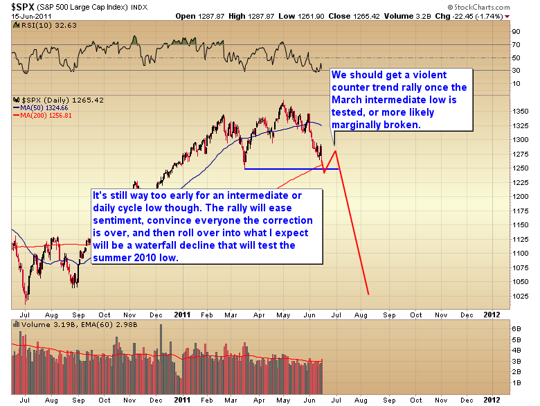 Here is what I expect to happen over the next two months. We should soon test the 1249 intermediate cycle low. Actually I think we will probably marginally break below that level. As most of you probably know by now breakdowns and breakouts almost always fail to follow through. So I expect we will see a violent counter trend rally once the March low is penetrated. That should wipe out all the technicians who sell into the breakdown.