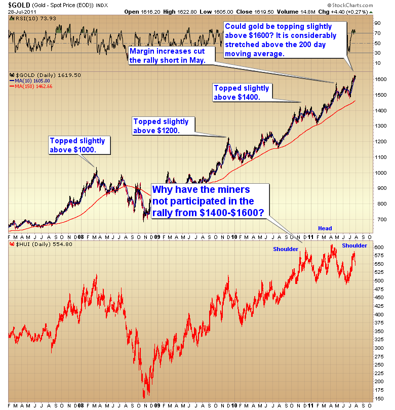 Another glaring discrepancy in that chart is the utter failure of the miners to participate in the last 200 point rally in gold. As a matter of fact the miners could possibly be forming a head and shoulders top.