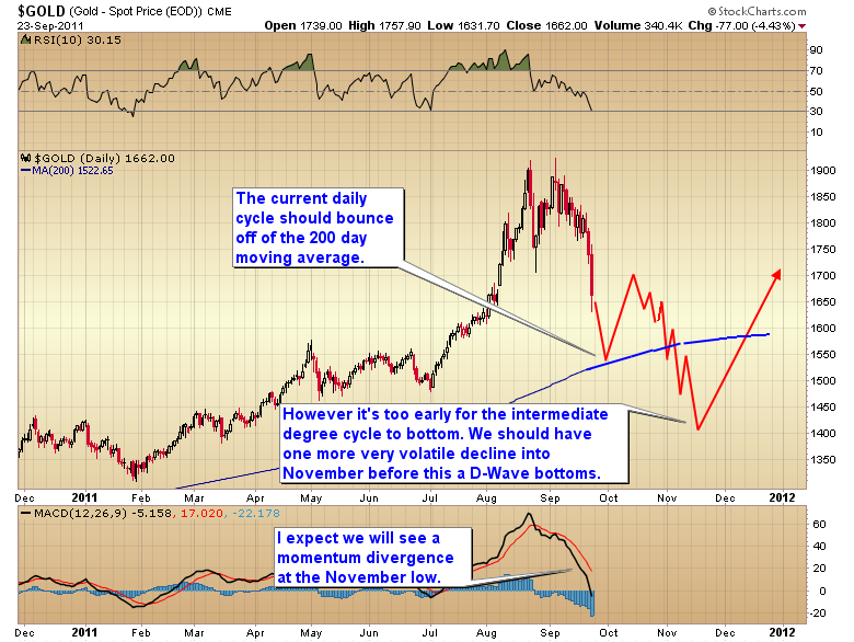 I suspect the next daily cycle is going to be a volatile nightmare that will chew up bulls and bears alike before a final plunge down below the 200 day moving average - somewhere between $1300-$1400. As all D-Wave declines have retraced at least 50 to 60% of the previous C-wave advance that would be a minimum target for the November bottom. At that point we should see a very powerful A-wave advance triggered by the extreme oversold conditions generated at the D-Wave bottom. More in the weekend report...