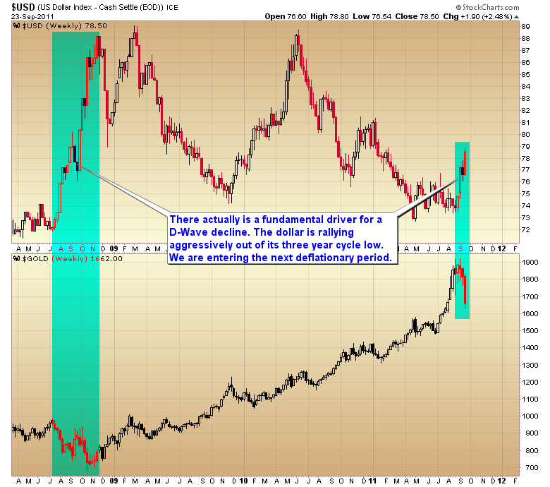 Actually there is a fundamental reason for a D-Wave decline besides just a normal regression to the mean, profit-taking event. The dollar has now moved into the aggressive stage of the rally out of the three year cycle low. Deflation is starting to take hold in the world again. In a deflation defaulting debt collapses the money supply. There is a growing shortage of dollars in the world. That's the reason why the dollar index is rocketing higher. As the value of the dollar rises during this deflation it takes less and less of them to buy an ounce of gold. You can see this same process unfolded as the dollar rallied out of the 2008 three year cycle low.