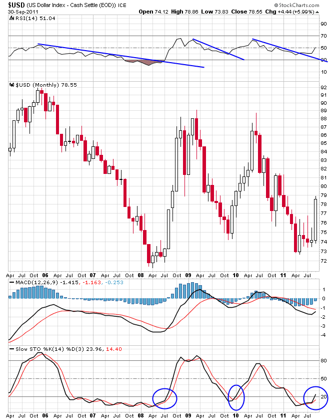 I am not saying the US Dollar (or any fiat currency) is a good long-term investment. Far from it. But the US Dollar is rising based on the same thing that happened in 2008. Many continue to deny that we are going through another 2008 episode and yet it is starting to happen right in front of our eyes. No, it's not exactly the same, but the same principle applies: forced de-leveraging due to a liquidity crisis. This is US Dollar positive and equity and commodity negative. People scream that Bernanke and his interventionalist compatriots around the world would never let it happen, but this is naive at best. Not only are they not as smart as the markets, but they are often far behind the curve when the crunch hits. Additionally, a cynic (realist?) would point out that another crisis would give central bankstaz and governments cover to do what they love to do: print more money, bailout banks and other corporations that contribute the most money to political campaigns, and enact ridiculous new rules and regulations that only benefit their friends.