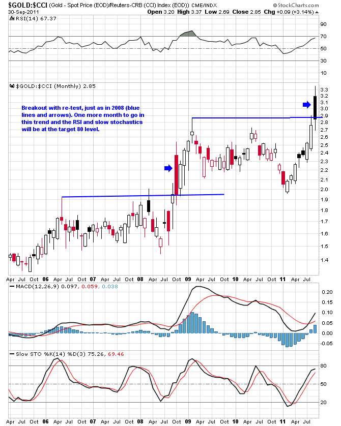 In any case, here is a 6.5 month chart of the Gold ($GOLD) to commodities (using $CCI as a proxy) ratio using a monthly plot of $GOLD:$CCI: