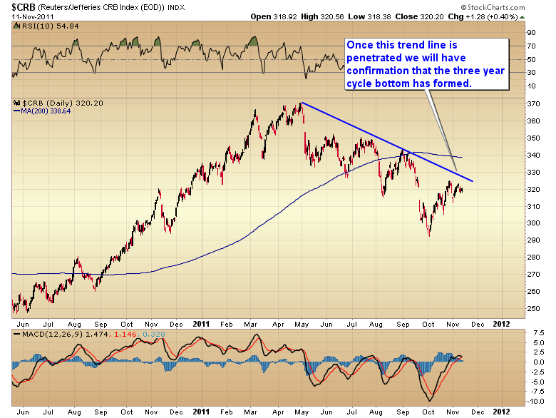 If that scenario plays out we are almost certainly going to see the CRB break it’s down trend line confirming a major three year cycle bottom has been formed.