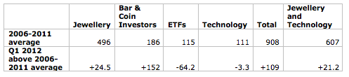 In Q1 2012, non-investment gold demand accounted for 61.8% of all demand (excluding Central Banks) - Q1 2006-2011 average share is 67.3%, which is above the current share. However, the current share is the highest since Q1 2011.