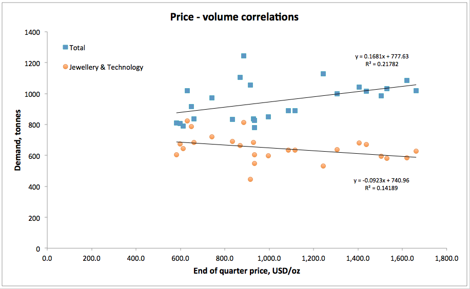 - Weak positive relationship between price and overall demand for gold. Funny thing is - if there's a bubble, you'd expect a much stronger relationship, don't you? After all, there would be hype of rapidly rising demand as prices rise?