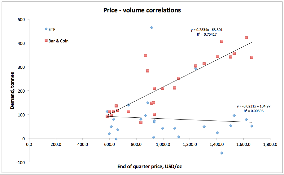 - There is a strong positive relationship between gold price and demand by gold bar & coin investors. Perverse? Not if you know that gold is an inflation / USD hedge.