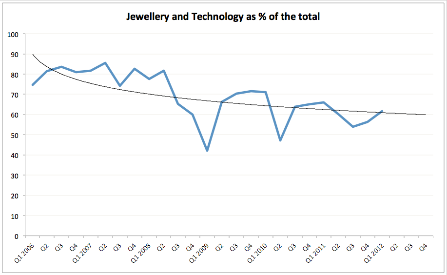 - Technology-related demand came in at 108 tons in Q1 2012, up on 104 tons in Q4 2011 (+3.8%), but down 6.1% y/y/ Peak Q1 demand for technology gold was in Q1 2008 and Q1 2012 demand came in 11.5% below that. Again, no serious drama here - some substitution away from higher priced gold, but also much of the effect due to global slowdown in production of white goods and electronics, plus price moderation in substitutes on the back of a global economic slowdown and crises.