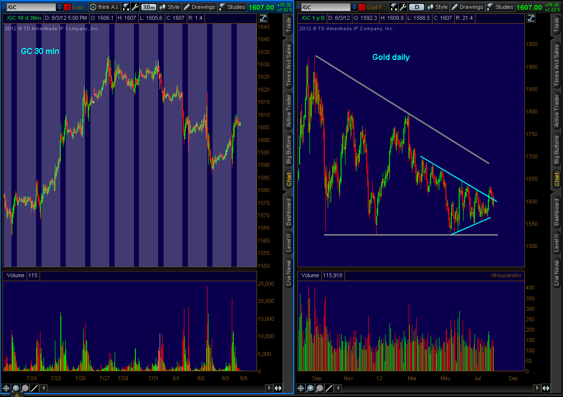I'm not ashamed to admit it; I took a net loss "day-trading" gold since the breakout of the triangle pattern on the daily chart. My trade setups were right, and there is ZERO regret. Looking back I did nothing wrong. While there is no way to control how much we make on a trade, we certainly can control our losses. Any trader who thinks they can be right all the time is going to have a tough time with the ego, which leads to a host of psychological issues and down a path toward ruin. My net loss in gold is less than 3/4 of one percent of the capital in my current trading account. The potential reward was a multiple of that risk. Bottom line is anyone who can't admit or is ashamed of losses is in the wrong business.