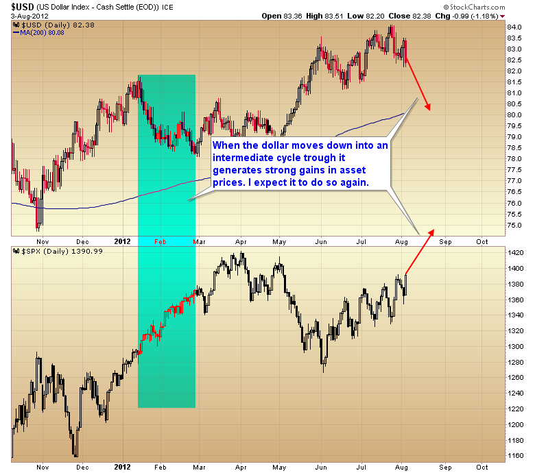 What follows, once the dollar bottoms and its next intermediate degree rally begins, is not going to be pretty. Stocks are going to start to struggle and ultimately move down hard in September and probably October if the Fed doesn't unleash QE3 at the September FOMC meeting.