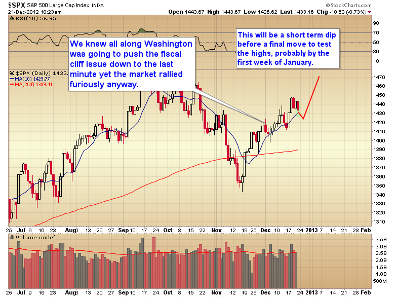The correction today is nothing more than a short-term breather before the market makes a final push to test the all-time highs, probably by the first week in January. I'm guessing we will get some kind of stopgap measure, or extension of the deadline next week that will trigger another explosive move up to test those September highs. At that point the market will find some excuse to drift down into a daily cycle low around the middle of January.