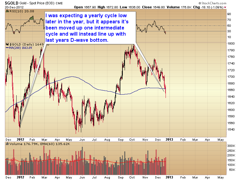 If you are back in cash I think I would advise waiting to see how gold reacts as the stock market launches out of this short-term correction. Like I said, that may be the trigger for gold to move down into the normal timing band for a daily cycle low and possibly a marginal break below yesterday's intraday bottom. If it does, that should mark a final yearly cycle bottom and trigger a big rally back up to test the September 2011 all-time highs.