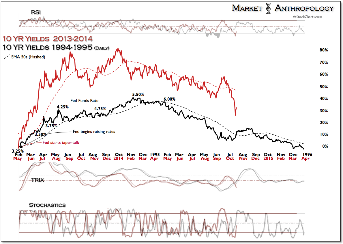 The expectation gapcrashed close last week - with all the subtlety of an elephant standing and leaving the room. All it took was a four week tour on the weak side of positioning, to panic participants out of their misplaced policy expectations of impending rate hikes by the Fed next year - or an imminent breakdown in the government bond market. Shortly after the equity markets opened Wednesday morning, 10-year yields collapsed some 14 percent below Tuesday's close, briefly touching 1.86% - the lowest since the Fed began their fireside taper-talks in May 2013. Likewise, 5-year yields collapsed 23 percent lower at the open, briefly touching below 1.2% - before recovering 10bps by the close. Just a few weeks back, participants had hung their hats on the notion that the Fed would need to act sooner rather than later, as economic conditions had improved and anxieties reigned supreme over what the Fed's exit plan would entail. For the week ending September 19th, which happened to mark the top in the S&P - as well as over three and a half year highs in 2 and 5-year yields, many believed the shorter end of the Treasury market was confirming exceptions that yields were headed higher - perhaps, materially so. This opinion was shared by a rather diverse group of personalities, that broadly influenced the ballast of the market - and included; hawks within the Fed itself, traders that continued to believe the over 30-year young bond bull was dead - as well as policy bulls that naturally saw real rates climbing as the Fed emerged triumphant from their extraordinary policy stance. If only they had listened to Yellen, who apparently didn't shared the same respective confidences of even the policy bulls themselves. Lower - longer. Lower - l o n g e r. For better or worst, there are two essential maxims we've had embroidered and framed, in navigating the intersection of markets and policy: listen to the leader and not the follower - and check your biases at the door. This sensibility was personified on Thursday, as Federal Reserve Bank of St. Louis President, James Bullard, quickly pivoted from last months tone of removing "considerable time" at the upcoming Fed meeting - to the possibility of maintaining QE for the foreseeable future. Perhaps follower is too kind. Nevertheless, we don't anticipate the Fed will take up QE4 anytime soon - or tighten, which would preserve Bullard's track record of handicapping the wrong pony, no matter which race. Although latent - hence the large expectation gap, the Treasury market has now caught up to expectations, as the calls for further tightening have finally been recognized as greatly misplaced. We have argued over the past year, that for all intents and purposes, the Fed has been tightening since they first brought up the taper in May 2013. At its most basic function, quantitative easing is enacted to instill expectations - beyond were conventional policy tools could apply. When the Fed began their fireside taper-talks in May 2013, they tightened in effect through a pivot in expectations. Considering the move in yields that followed, this was largely confirmed by the market - and why we have contrasted the trend in 10-year yields throughout this year with the arc of the unexpected rate tightening cycle that began in February 1994.