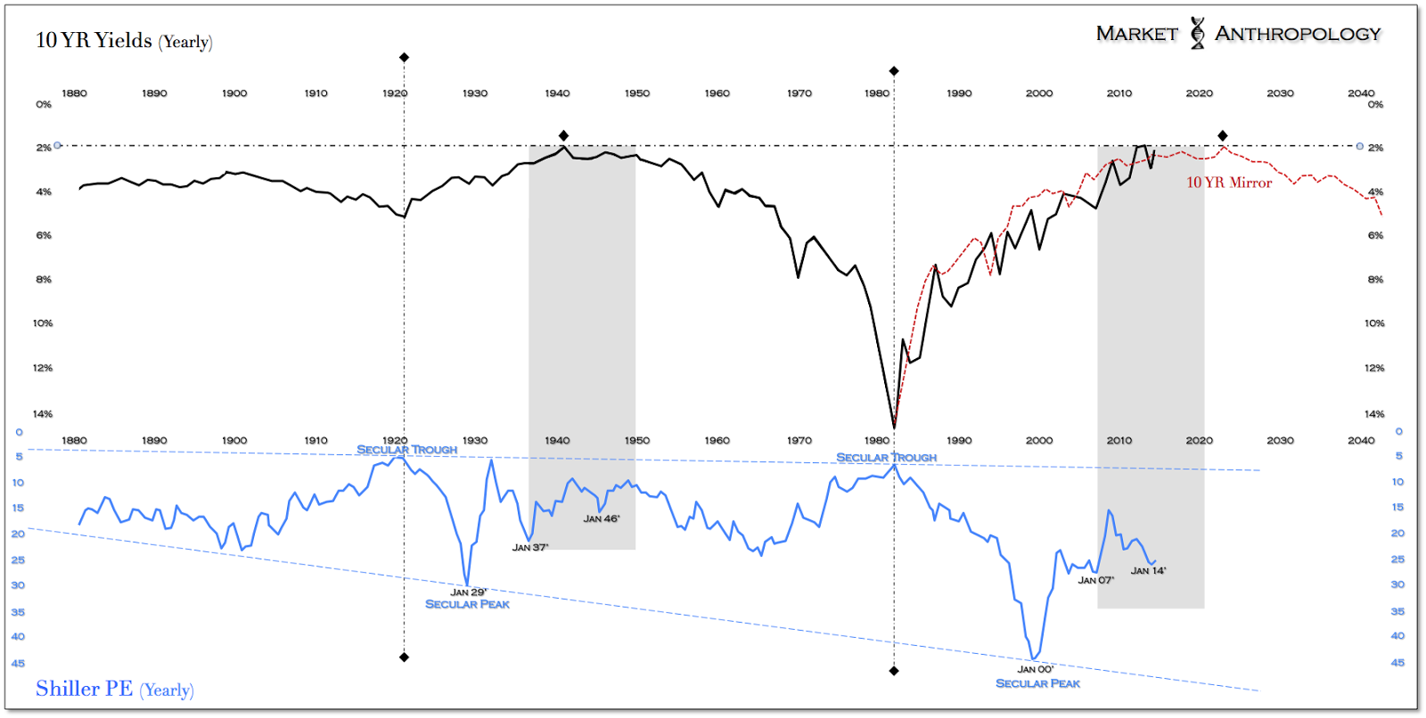 Building on the tenor of last weeks note, the similarities still resonate of a cyclical top in the US equity markets, reminiscent of the last time the government conspicuously supported the markets in like proportions through large-scale asset purchases. Not surprisingly, the 1940's were also a time period in which participants remained shell-shocked from the 1930's and maneuvered between the equity and Treasury markets, as if another depressionary and deflationary wave would unfurl when the Fed and Treasury stepped aside. When they finally did in 1946, the self-fulfilling prophesy manifested in a swift 30 percent revaluation in equities - while participants panicked and hunkered down in Treasuries expecting another chapter of the Great Depression to unfold. Sound familiar? Krugman apparently thinks so too. As the Fed looks to wind down QE later this month and with the equity markets coming under pressure once again, the natural comparative reaction is to assume the Fed will cow-tow to market pressures, as they have before; or in absence of that support - assume the worst and a downturn on par with the two previous bear markets (2007 and 2000), or as Krugman fears - a 1937-esque collapse. Broadly speaking, we don't find the same excesses available in the markets - both domestically and globally, or underlying economic conditions that are typically required to support declines of that magnitude. Moreover, we would argue that from a comparative perspective of valuation trends in equities relative to the long-term yield cycle (see below), the bear market that began in 2007 was our 1937. The third peak from the secular high would be our 1946, which just happens to be the last time the government spoon fed the markets and the mirror of the cycle in 10-year yields.