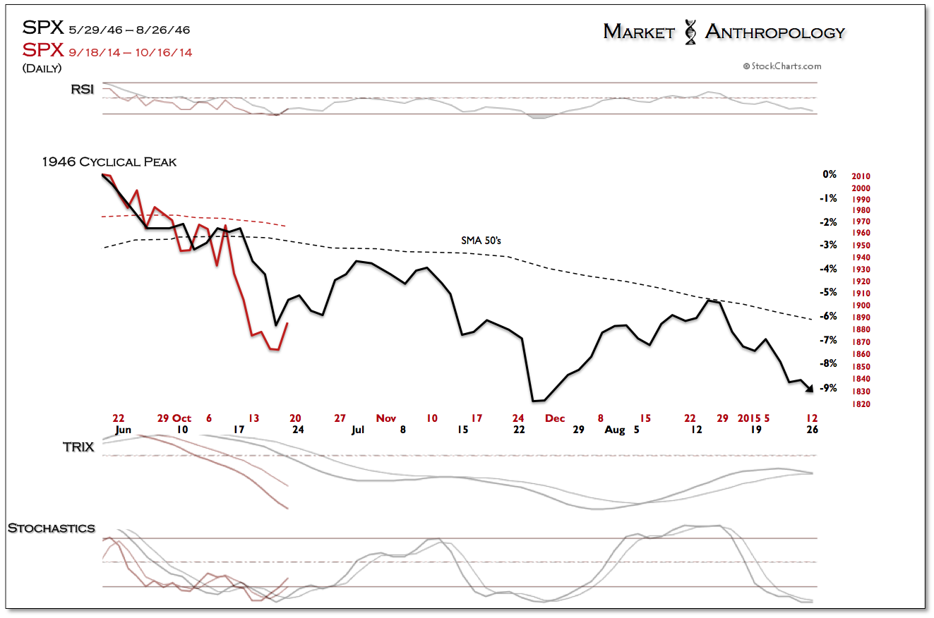 Overall, we find that the two studies reflect the expectation gap that just closed and a market environment sputtering from benevolent and complacent conditions, that one could argue has been greatly supported by the active and visible hand of the Fed. Taken in context with our previous work, we continue to find the historic parallels with the 1940's compelling and worthy of further contrast. As is the case with all comparative reasoning, we primarily use the work to generate a strategic outlook of what might lie ahead - based on similar market conditions in the past. It is rarely a refined and discriminative inference, but very much a composite sketch between quantitative and qualitative conditions. That said, below is a comparative momentum and performance study normalized between the cyclical peak in 1946 and the current high in the SPX on September 18th. Based on this study, the equity markets would retrace the decline over the next few weeks, before resuming the downtrend in November.