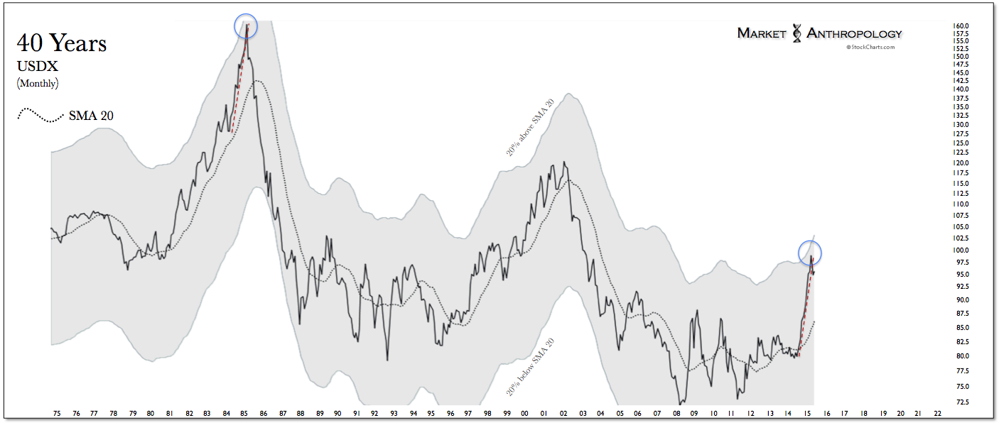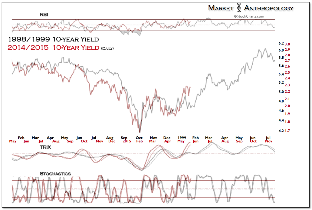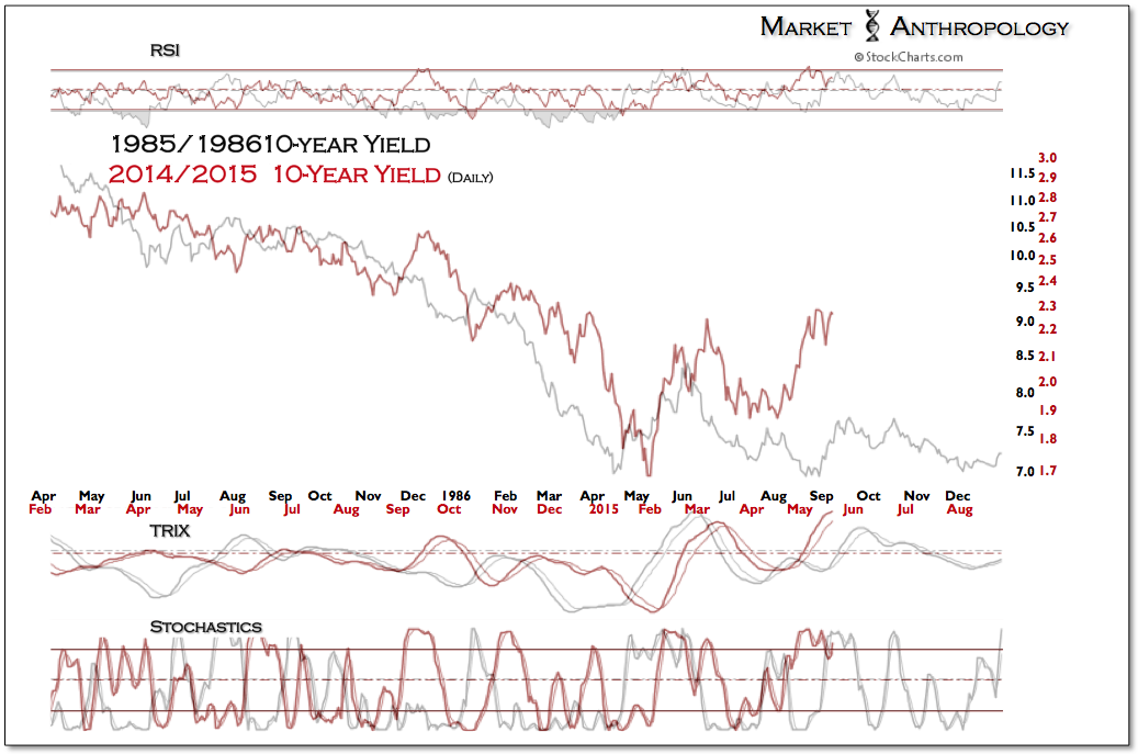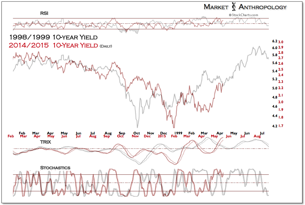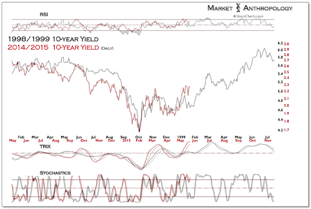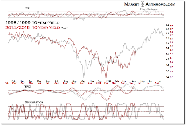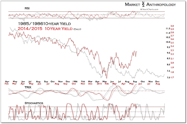 Today, as investors grapple with the more esoteric nature of monetary policy enacted in the trough of the long-term yield cycle, you'll find greater bi-polar reactions in the market and the media to economic data and various policy opinions within the Fed. Ultimately, we suspect the Fed will continue to err on the side of caution, which over the long-term supports a reflationary strategy in the market that favors hard commodities - such as oil, precious metals and copper - over what strongly outperformed over the past six years, namely US equities. Over the short to intermediate-term, we'd expect that the largest tactical threats to this posture would come from a more hawkish tone from the Fed that would favor an earlier move towards raising rates here in the US - or a sustained downturn in the US economic data that could reignite broader disinflationary conditions. However, all things considered, we expect the Fed will walk a more deliberate policy path, as the economy continues to mend from the financial crisis and the magnitude of any potential tightening regime is realized to be far less than anticipated or witnessed in more recent Fed tightening cycles over the past several decades. We continue to closely follow the SPX:Oil ratio through a comparative prism of the two major exhaustion pivots (1986 & 1999) that make up the asymmetrical disinflationary/reflationary construct that the ratio represents. Although both timeframes depict market environments that saw oil outperform equities over the subsequent year, there were notable differences in the magnitude of the moves relating to various intermarket relationships - namely, inflation and policy expectations which greatly determined the direction of yields for the year.