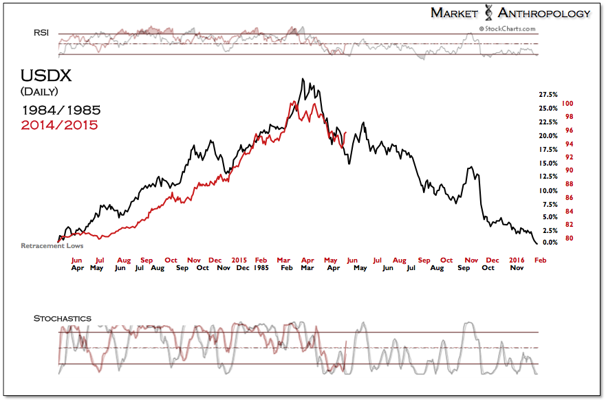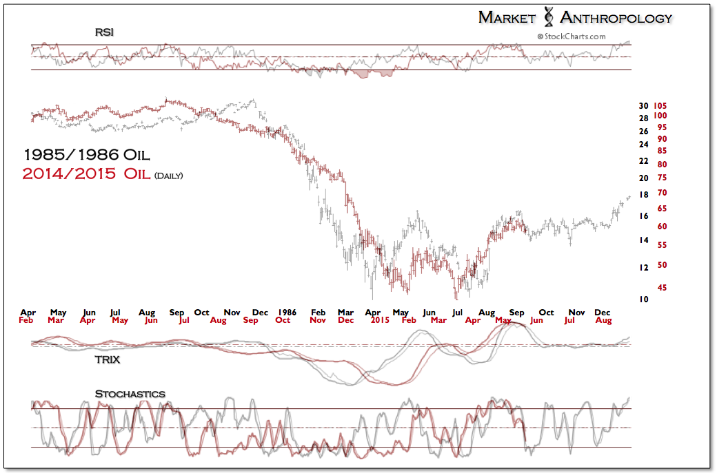 As shown above in the juxtaposition series between oil and yields (Figures 4-5), both 1986 and 1999 expressed lagged pivots between the two markets. In 1986, oil set the final low 7 weeks before yields and in 1999, yields reversed 10 weeks before oil. Measured along the same weekly timeframe, yields this year reversed 6 weeks before oil.
