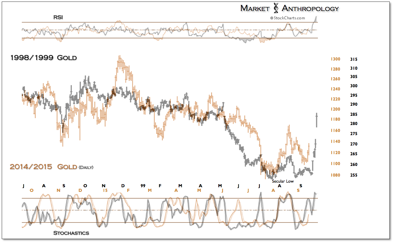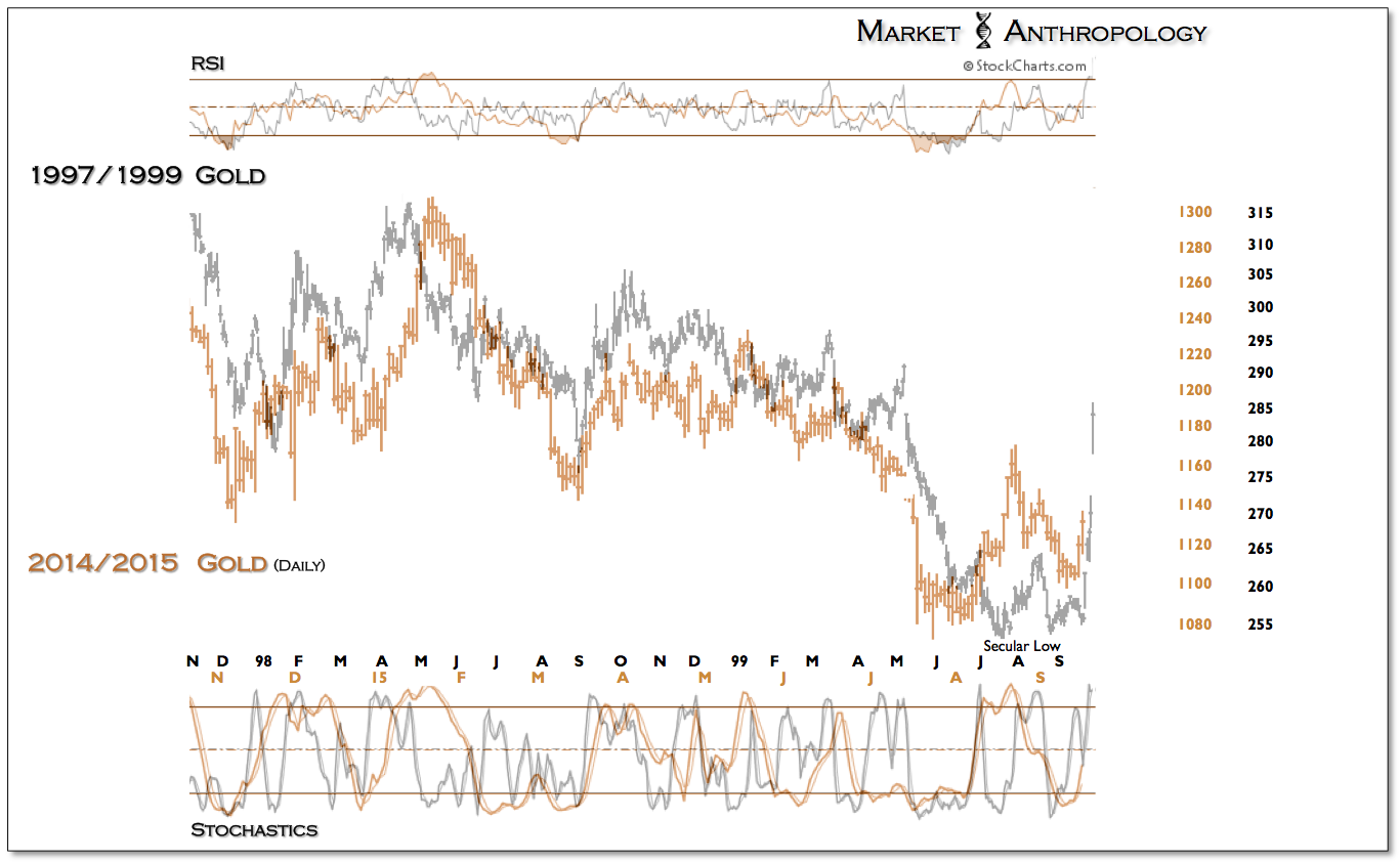 In the wake of the September pass, the similar performance pattern that we've followed throughout the year with gold's secular low in 1999, appears to have successfully retested the lows from this summer and is now climbing the stairs out of the basement on the wings of less hawkish expectations.