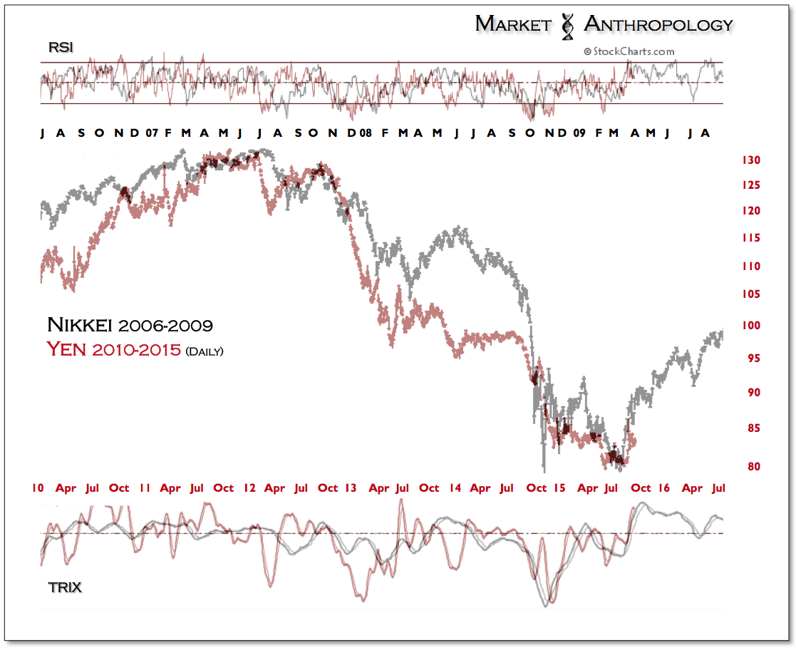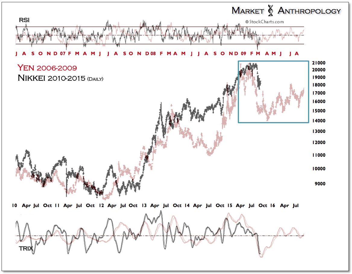Trending with gold through broad dollar weakness, the yen has led the way higher as expected. With volatility increasing in the wake of yesterday's decision, we included updates of the yen and Nikkei series from Monday's note (see Here) - as well as an exploded view of the anticipated next leg lower in the Nikkei that appears underway.