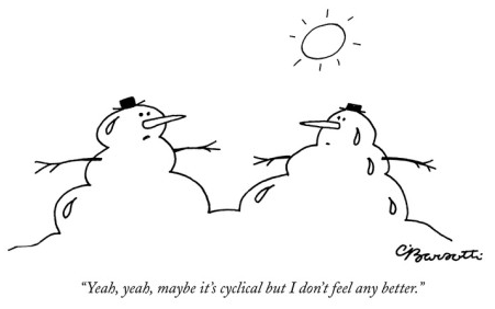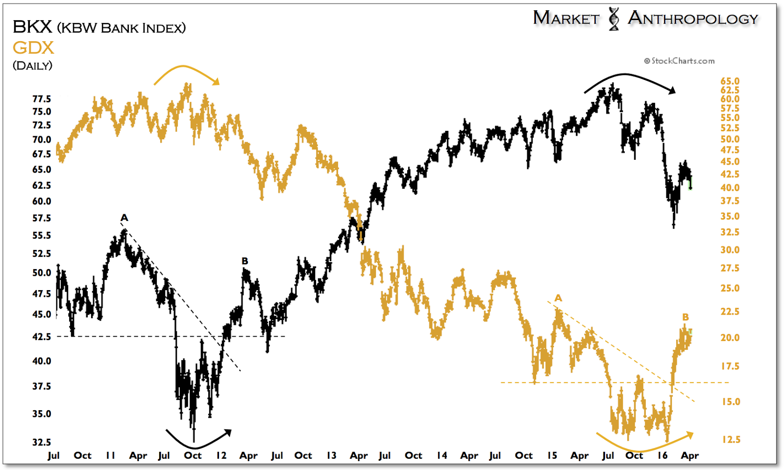 Over time - and as framed below by the chart of the financial sector and the gold miners, we expect the divergence in performance to narrow considerably, as gold leads the commodity sector finally out of a cyclical low and as equities retrace from a corresponding high.