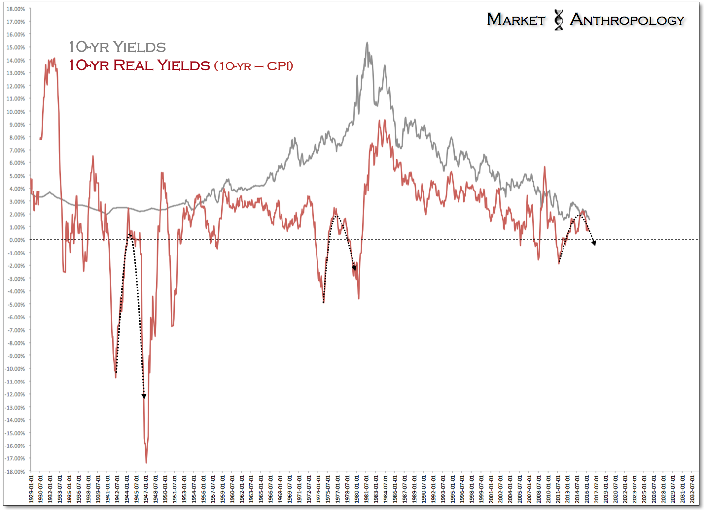 One of our long-standing suspicions has been that the 2011 cycle lows for real yields would eventually be broken on the next leg down. This belief has largely maintained our interest in the precious metals sector that exhibits a strong inverse correlation to real yields. From our perspective, the probability that inflation would eventually outstrip the reach of nominal yields – was more likely, than a continuation of the atypical market dynamics engendered by the Fed during the taper-tantrum, where real yields spiked on greatly overblown fears of higher rates – but inflation wilted on the vine. In a more typical and “organic” market environment where monetary policy was not enacted at ZIRP or after extended periods of large-scale quantitative easings, real rates begin to rise when benchmarks and expectations of improving growth is followed by tighter policy and a decline in inflation expectations. At secular cycle lows, real rates surge as the inflation cycle crests and retreats – and after nominal yields remain supported.