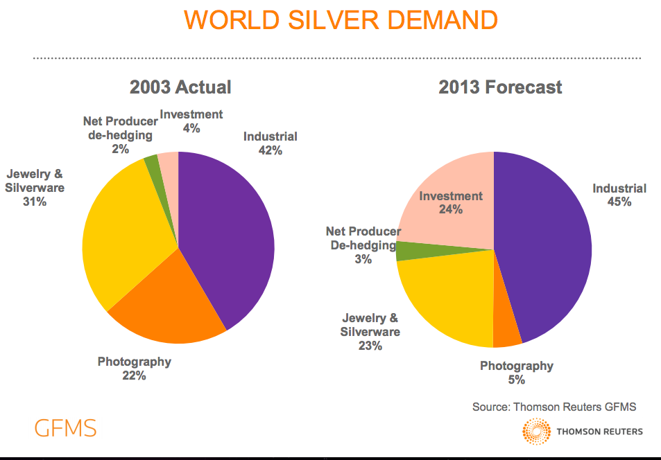 Approximately 25% of the world’s annual silver supply is used in .999+ fine investment grade bullion products. According to Reuters, in 2003 this figure was only 4%. The world has made a massive increase in silver investment buying over the last decade.