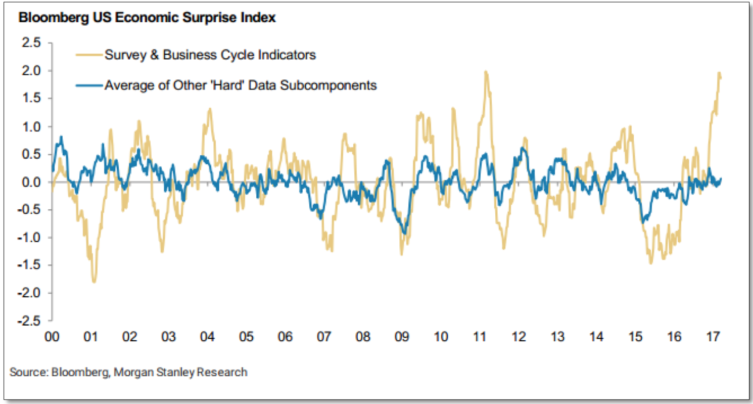 In fact, the spread between these so called hard and soft data series is the widest it's been over the past 2 decades. And while greater confidence can certainly positively affect downstream realized growth, eventually sentiment needs to give way to either businesses and consumers actually pulling the trigger on spending, or realizing that their respective hopes may have stepped ahead of reality. With the third longest economic expansion since 1850 already in the record books and with the US job market even below what the Fed considers as “full employment”, we’re more inclined to believe that while deregulation and tax reform can definitely improve conditions around the edges for businesses and consumers going forward, the real potential for robust growth that the recent sentiment surveys have implied has largely been tapped over the past several years.