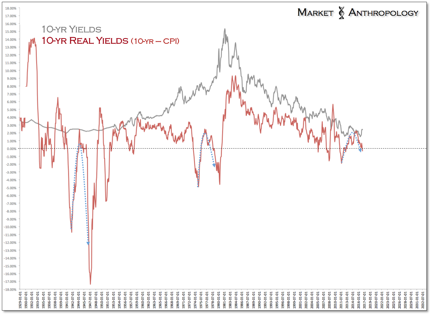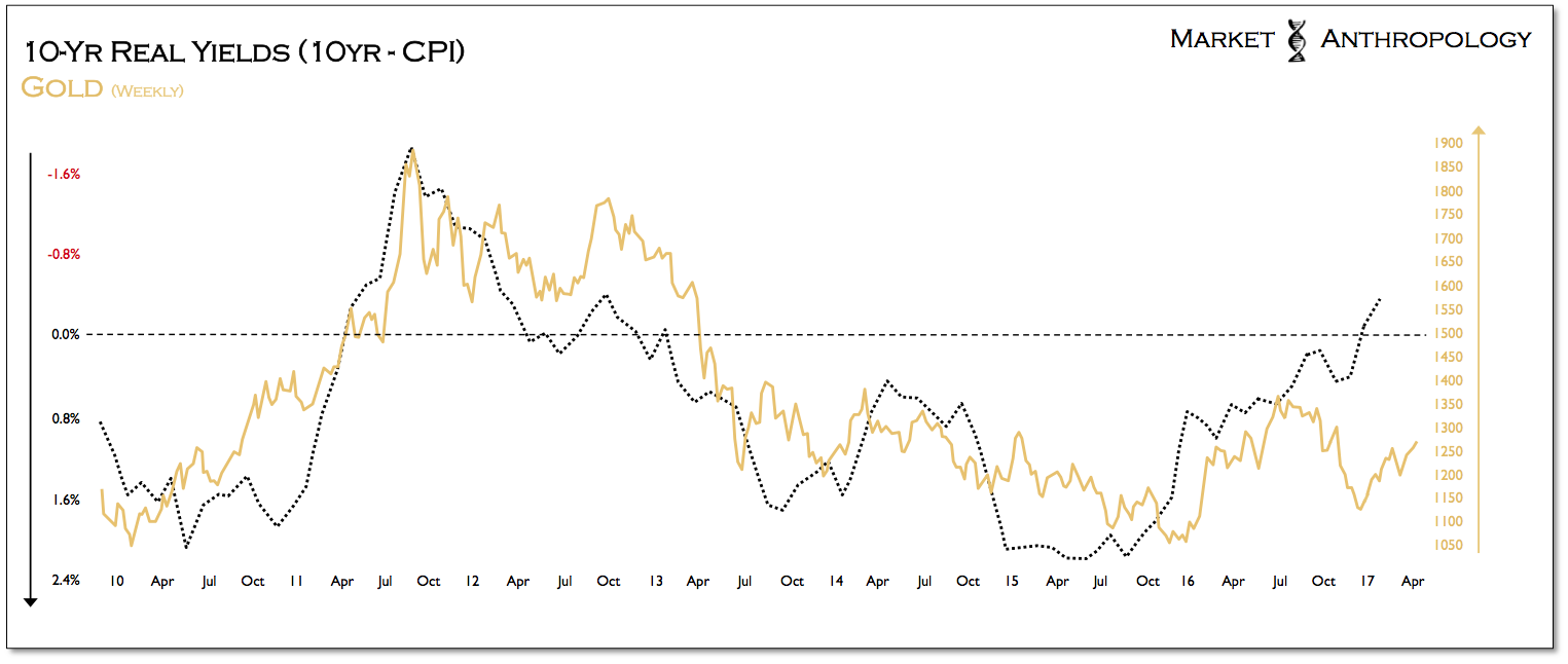 Since the end of 2015 where gold had set a cycle low in December as realized inflation had also begun to move out of the trough of the cycle, real yields began to crest and decline – despite the Fed’s policy shift in raising rates from ZIRP that month.