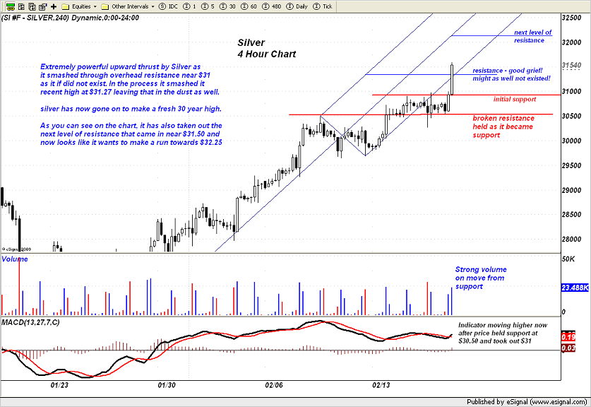 “The big news today is silver. It is screaming higher dragging nearly every single metal upward with it. You name it, whether it was gold, copper, platinum or palladium, silver pulled them all higher as it hit a fresh 30 year high shattering overhead chart resistance as if it was nonexistent. Once $31 was breached on the upside, terrified bears began fleeing in droves. That took the price up past $31.27, the recent peak which forced out more shorts and brought in a rush of fresh buying that ran the market all the way to $31.50 or so before it set back a bit.