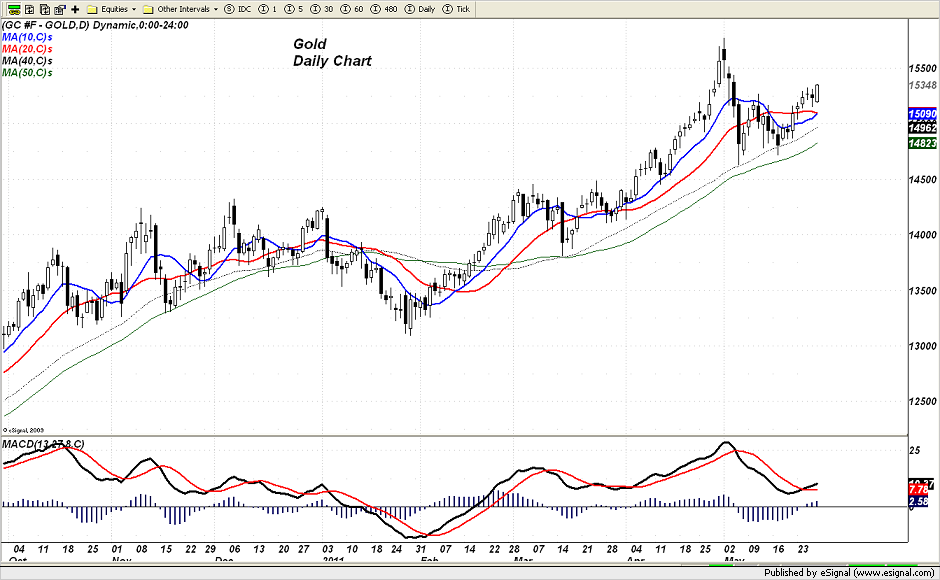 Based on what I can see here, gold looks as if it wants to make a try at $1550, one of those even numbered levels that takes on a technical significance as price approaches it. It is important to note that this is occurring late in May, a time frame during which gold tends to show seasonal weakness. This seasonal weakness however can be attributed to factors, which while important, are not what are driving gold at this time. The festival seasons from Asia and India are over and the strong jewelry related demand is therefore missing. However, gold is not deriving the bulk of its strength from that source but rather from currency related matters.