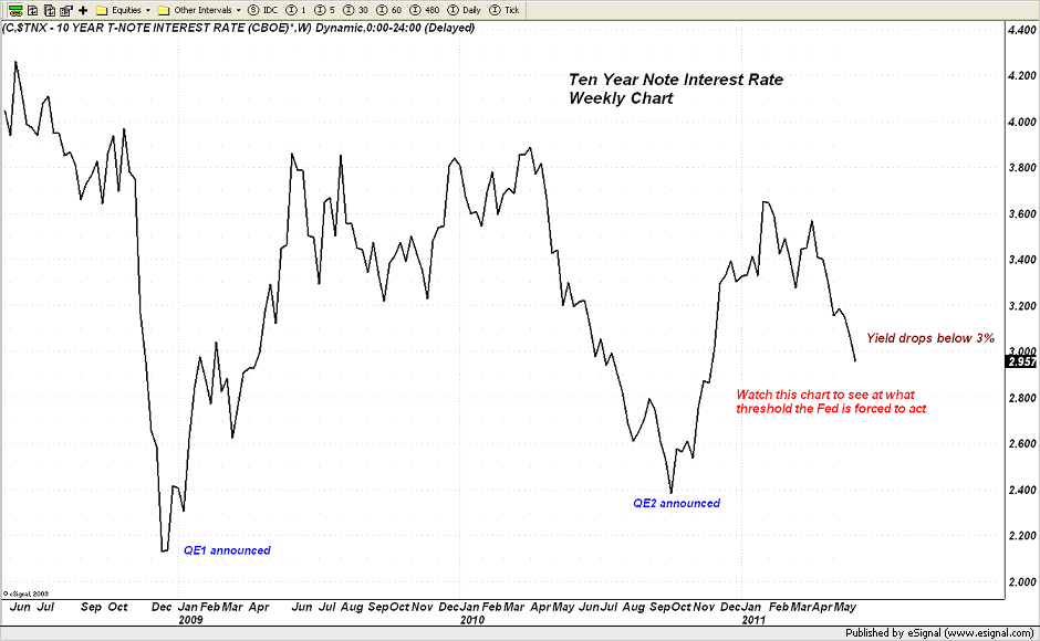 “Take a look at the following two charts. These tell you all you need to know about the market's view towards Federal Reserve policy. As you know by now, the Fed is supposedly going to end QE2 at the end of this month. Ever since that announcement, coupled with continued disappointingly weak economic data, the yield on the Ten Year has fallen and the US equity markets have swooned.