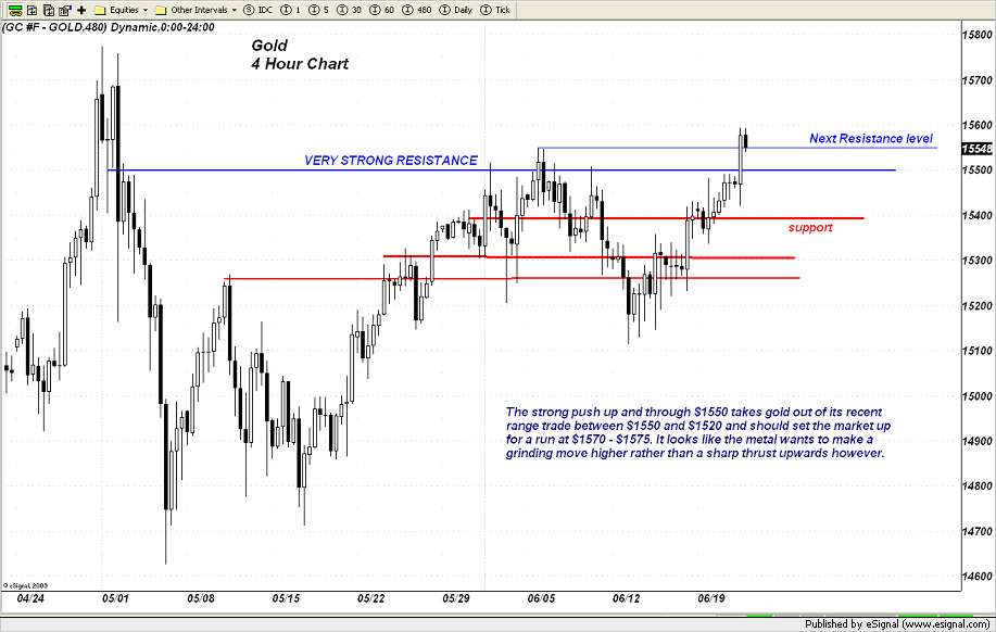 From a technical perspective, the strong move past this solid resistance level, takes the market out of the recent tight range trade bounded by $1550 on the top and supported at $1520 on the bottom. It is now poised to make a run towards $1570-$1575. Downside support moves up initially towards $1540 followed by good support near $1530.