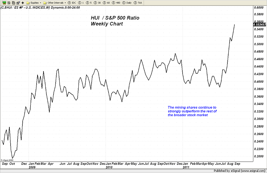 Considering the debacle unfolding in the equity markets today, the HUI or mining shares index, is once again holding remarkably firm as this sector continues to outperform the rest of the broad market.