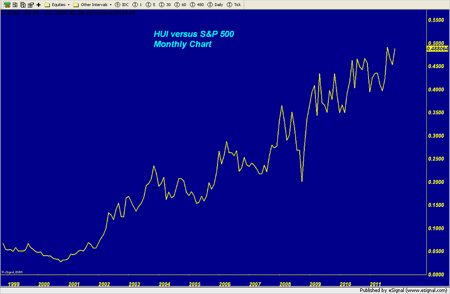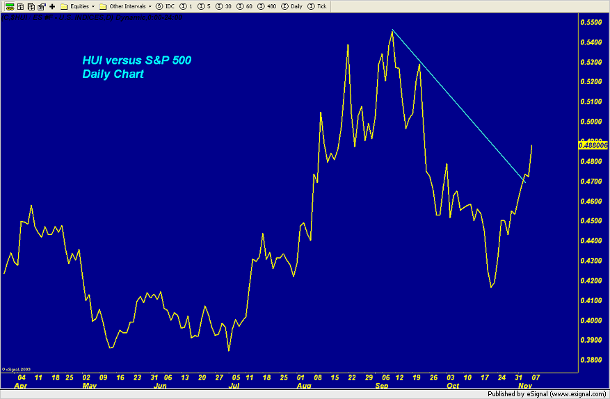 “Mining shares are getting a very strong bid in today's session taking the HUI up sharply through the 600 level, a psychological resistance level. As you can see on the chart, the index is moving ever closer to the top of the recent chart gap created last month when the shares were sold off during a downdraft in both the gold and silver bullion markets. I would expect the perma bears in the shares to try to make an effort to hold the index BELOW this resistance level. If they fail, I believe there will be enough momentum in the sector to mount a move back to the recent all-time high.