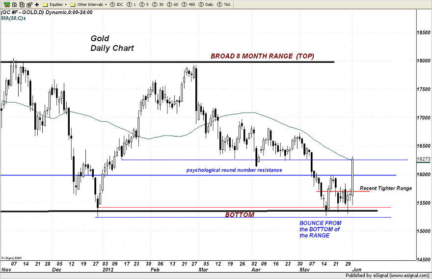 “Gold's reaction to the payrolls number this morning was instantaneous - it shot up as if it was fired out of a cannon! As stated in the post on the mining shares this AM, gold is now fully expecting the Fed to move forward with a round of QE3 Sooner rather than later. It is this anticipation of a Fed move that has it blowing the recent hedge fund short positions out. Not only that, the ability to capture this elusive "16" handle and HOLD IT, has fresh money that has been sitting on the sidelines or in Treasuries (obtaining next to nothing for yield) willing to come in on the long side of this market.