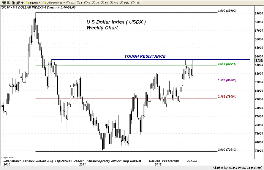 That being said, this buying has pushed the Dollar right smack dab to an important technical resistance level on its longer term chart. If you note, it has already bested both the 50% and the 61.8% Fibonacci retracement levels of the entire decline from back in 2010 to 2011. It remains above this latter level this week. If it can push through that overhead resistance line, there does not appear to be a whole lot between it and the 2010 peak. That means it would have the potential to make a run towards the 89 level.