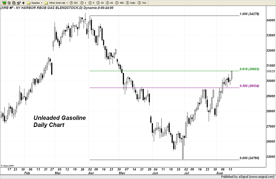 Note that the gasoline market has retraced 61.8% of its entire decline from the peak made earlier this year. That is a key Fibonacci retracement level. If it powers up and through this level, particularly if it closes the week above this level, odds will favor a push towards $3.20 initially followed by a test of the high near $3.40 if the former level does not hold. Generally speaking, if a market fails at the 61.8% level, it will drop back towards the 50% level and retest that to see if the bulls are still eager to buy.