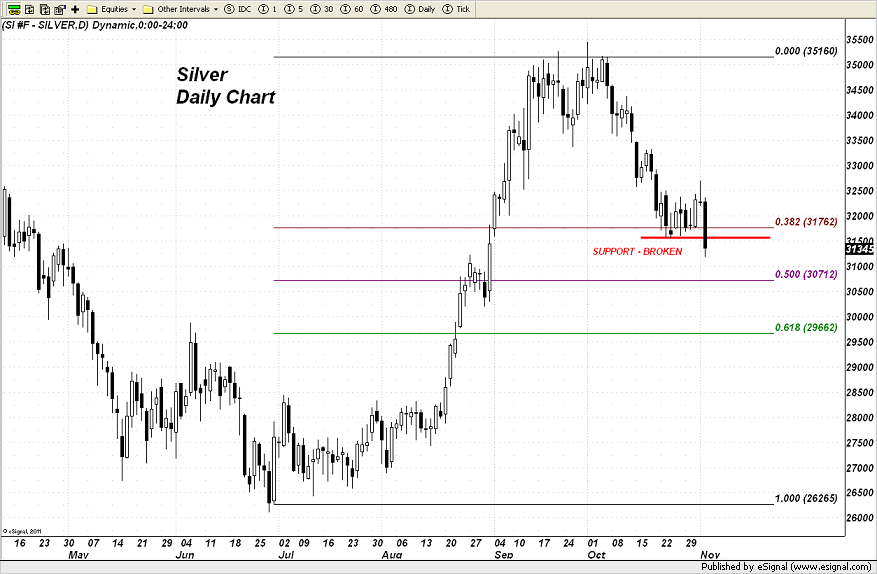 Notice also how silver has lost support at the bottom of the recent congestion pattern which also was rather close to its 38.2% retracement level. If it cannot reverse the decline and get back above the 32 level, it will more than likely drift first towards psychological round number support near $31 and stronger chart support down near $30.70 - $30.75.”- Dan Norcini, More at http://www.traderdannorcini.blogspot.com/