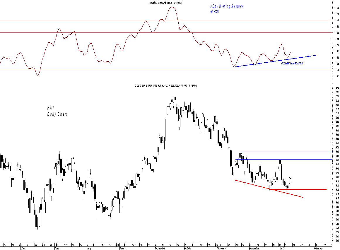 Following the breakdown from the September high, as price descended, the RSI followed it lower in a rather smooth fashion. Lower prices on the HUI were matched by lower levels on the RSI. That continued until the middle of November when the index caught a bit of a short covering pop that looked as if it might put an end to the decline.
