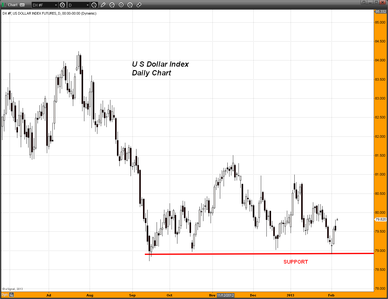 I want to continue to monitor this chart, especially in relation to the price of gold. So far the rising Dollar has not negatively impacted the price of gold as it has bounced off the $1660 level in spite of the US Dollar move higher off of its support level. We might need to see the Dollar break down however before gold can take out that very formidable resistance level above $1695 and extending to $1700. It seems that the stall in the US equity market move higher has generated a bit of safe haven buying in the metal for the immediate time being.