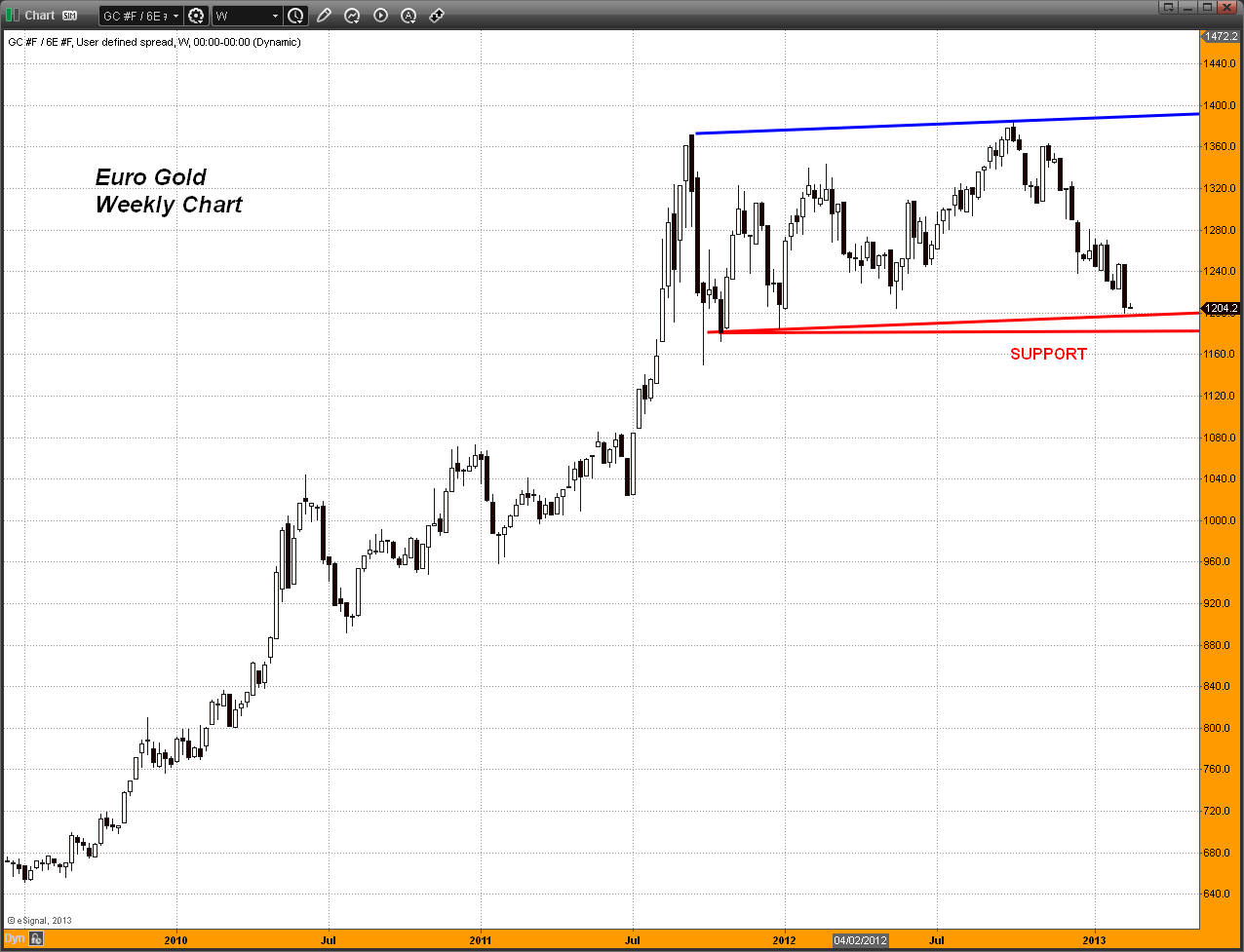 See also this Euro Gold chart which displays a consolidation pattern much like the Swissie Gold chart above. Gold is probing the lower boundary of the channel noted and is moving towards the 1200 Euro region. Since last summer, buyers have surfaced in this area.