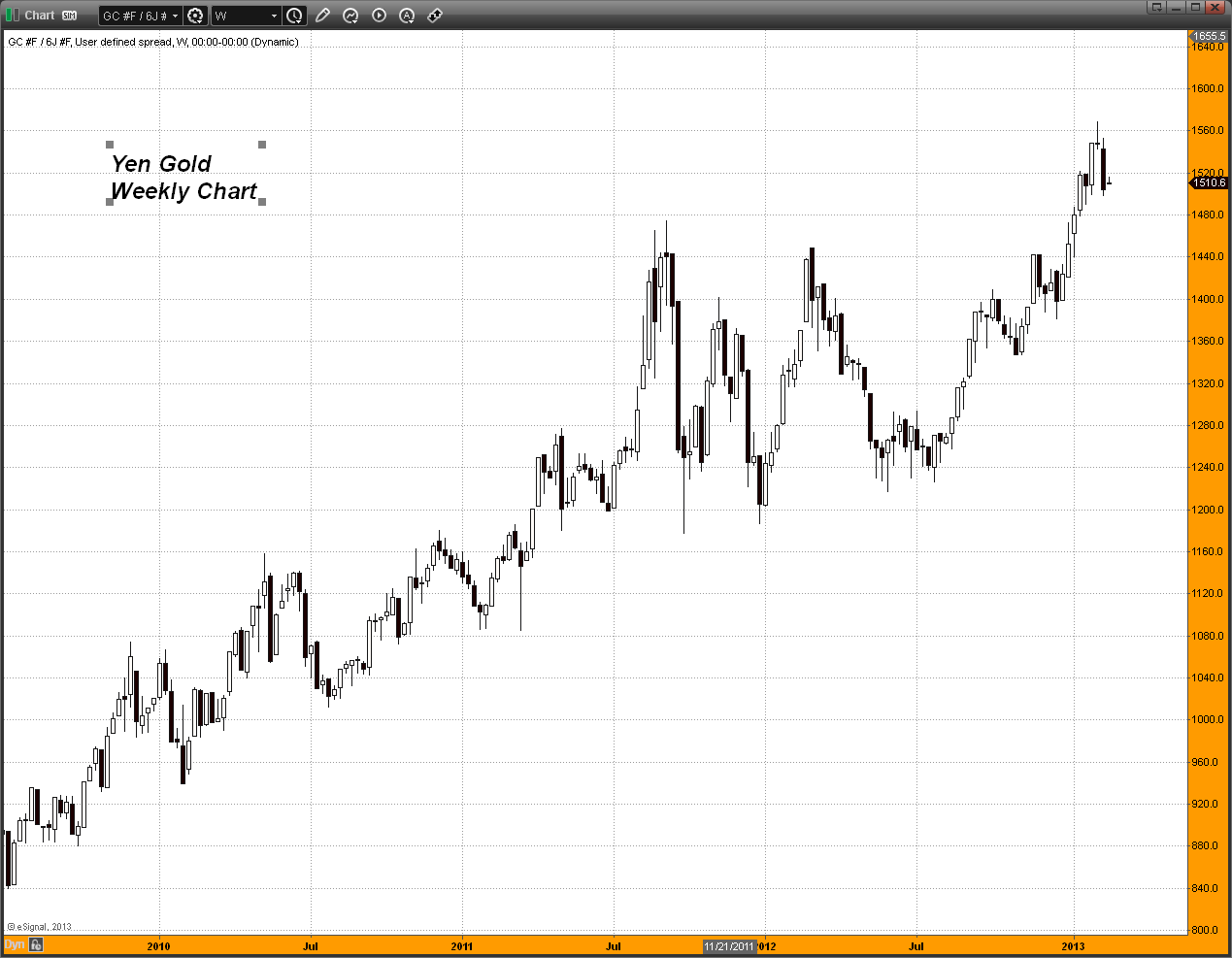 I should also note here that while both the Yen and the British Pound have fallen rather sharply against the US Dollar, the Sterling gold chart is nowhere near as bullish as the Yen Gold chart. Yen Gold is evidencing a pause up at current levels whereas Sterling Gold is approaching the bottom of its range trade.