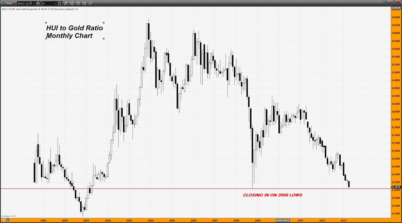 I will leave you with a ratio chart of the HUI to Gold price. It is now closing in on the 2008 low. Keep in mind, this is AFTER FOUR ENORMOUS QUANTITATIVE EASINGS attempts. What in the world will it take for these stocks to do anything if 4 rounds of QE cannot take them higher? Makes me seriously wonder if some of the gold mining companies are going to survive to be honest.