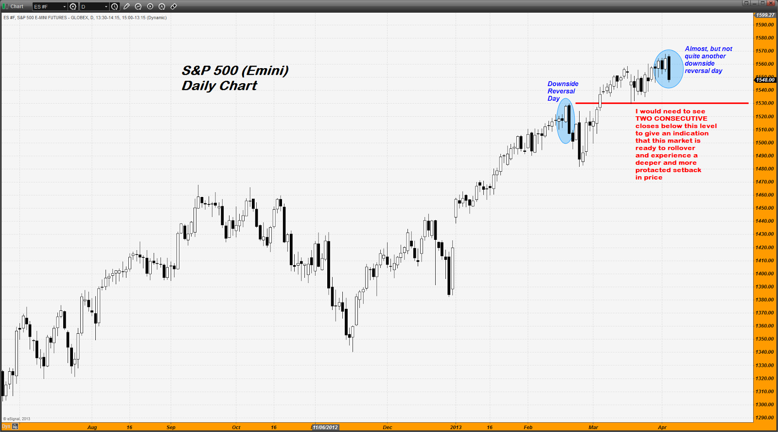 The S&P just missed putting in a downside reversal because its session high did not exceed the session high from yesterday. Nonetheless, the sell off has been strong and is coming on high volume. We have seen these fake outs before however in this market as we just had one show up on the chart a mere six weeks ago that lasted every bit of a few days before we once again went on to make yet another new high. Maybe this one is for real. We'll see.